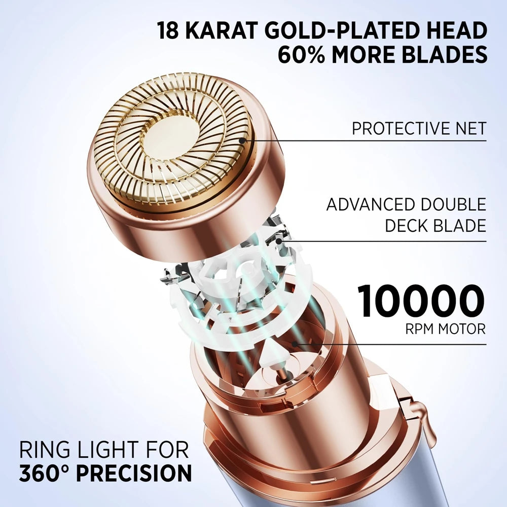 Its 18K gold-plated hypoallergenic head glides smoothly across your skin, making it perfect for sensitive areas like your eyebrows, upper lip, chin, underarms, and more.